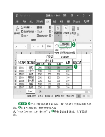 打开【新建名称】对话框,在【名称】文本框中输入名 称; 在【引用位置】参数框中输入公 式“=sum(Sheet1!$C$4:$F$4)”; 单击【确定】按钮,如下图所 示。