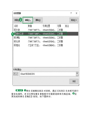 弹出【编辑名称】对话框,通过【名称】文本框可进行 重命名操作,在【引用位置】参数框中可重新选择单元格区域; 设 置完成后单击【确定】按钮,如下图所示。
