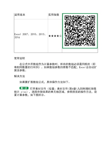 适用版本 实用指数 Excel 2007、2010、2013、 2016 ★★★★☆ 使用说明 在公式中用数组作为计算参数时,所有的数组必须是同维的(即 有相同数量的行和列)。如果数组参数的维数不匹配,Excel会自动扩 展该参数。 解决方法 如果要扩展数组公式,具体操作方法如下。 打开素材文件(位置:素材文件\第6章\九阳料理机销售 统计.xlsx),选择存放结果的单元格区域,参照前面的操作方法,设 置计算参数,如下图所示。