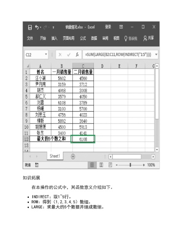 知识拓展 在本操作的公式中,其函数意义介绍如下。 INDIRECT:取1~5行。 ROW:得到(1,2,3,4,5)数组。 LARGE:求最大的5个数据并组成数组。