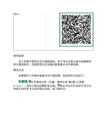 2016 使用说明 在工作表中使用公式计算数据后,除了可以在单元格中查看最终 的计算结果外,还能使用公式求值功能查看分步计算结果。 解决方法 如果要在工作表中查看分步计算结果,具体操作方法如下。 打开素材文件(位置:素材文件\第6章\工资表 3.xlsx),选中计算出结果的单元格; 单击【公式】选项卡【公式 审核】组中的【公式求值】按钮,如下图所示。