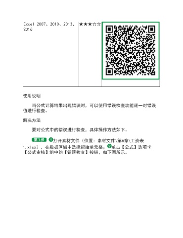 Excel 2007、2010、2013、 ★★★☆☆ 2016 使用说明 当公式计算结果出现错误时,可以使用错误检查功能逐一对错误 值进行检查。 解决方法 要对公式中的错误进行检查,具体操作方法如下。 打开素材文件(位置:素材文件\第6章\工资表 1.xlsx),在数据区域中选择起始单元格; 单击【公式】选项卡 【公式审核】组中的【错误检查】按钮,如下图所示。