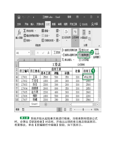 系统开始从起始单元格进行检查,当检查到有错误公式 时,会弹出【错误检查】对话框,并指出出错的单元格及错误原因。 若要修改,单击【在编辑栏中编辑】按钮,如下图所示。