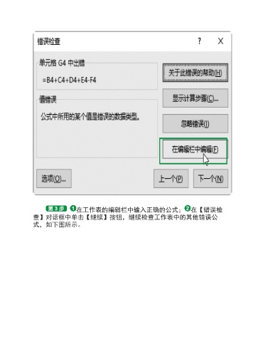 在工作表的编辑栏中输入正确的公式; 在【错误检 查】对话框中单击【继续】按钮,继续检查工作表中的其他错误公 式,如下图所示。
