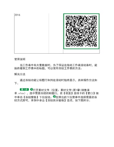 2016 使用说明 当工作表中有大量数据时,为了保证在拖动工作表滚动条时,能 始终看到工作表中的标题,可以使用冻结工作表的方法。 解决方法 通过冻结功能让标题行和列在滚动时始终显示,具体操作方法如 下。 打开素材文件(位置:素材文件\第1章\销售清 单.xlsx),选中需要冻结的标题行,在【视图】选项卡的【窗口】组 中单击【冻结窗格】下拉按钮; 在弹出的下拉菜单中选择需要的冻 结方式即可,本例中单击【冻结拆分窗格】选项,如下图所示。