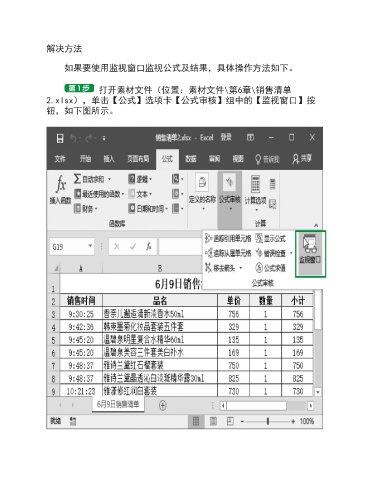 解决方法 如果要使用监视窗口监视公式及结果,具体操作方法如下。 打开素材文件(位置:素材文件\第6章\销售清单 2.xlsx),单击【公式】选项卡【公式审核】组中的【监视窗口】按 钮,如下图所示。