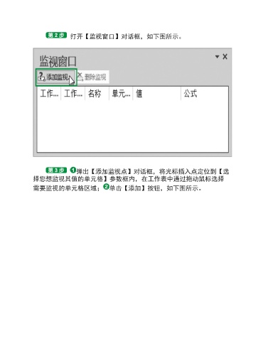 打开【监视窗口】对话框,如下图所示。 弹出【添加监视点】对话框,将光标插入点定位到【选 择您想监视其值的单元格】参数框内,在工作表中通过拖动鼠标选择 需要监视的单元格区域; 单击【添加】按钮,如下图所示。