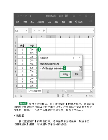 经过上述操作后,在【监视窗口】的列表框中,将显示选 择的单元格区域的内容以及所使用的公式。在列表框中双击某条单元 格条目,即可在工作表中选择对应的单元格,如右上图所示。 知识拓展 在【监视窗口】的列表框中,选中某条单元格条目,然后单击 【删除监视】按钮,可取消对该单元格的监视。
