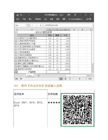 182 使用【自动求和】按钮输入函数 适用版本 实用指数 Excel 2007、2010、2013、 ★★★★★ 2016