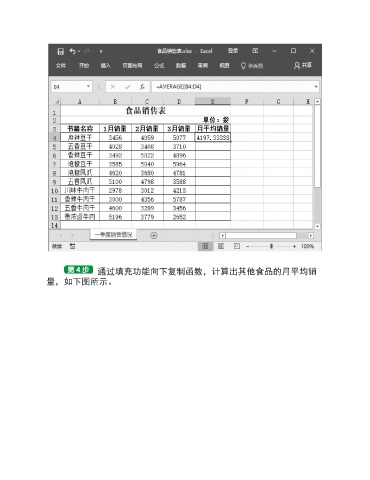 通过填充功能向下复制函数,计算出其他食品的月平均销 量,如下图所示。