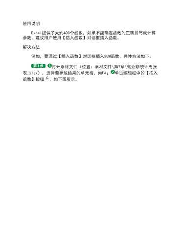 使用说明 Excel提供了大约400个函数,如果不能确定函数的正确拼写或计算 参数,建议用户使用【插入函数】对话框插入函数。 解决方法 例如,要通过【插入函数】对话框插入SUM函数,具体方法如下。 打开素材文件(位置:素材文件\第7章\营业额统计周报 表.xlsx),选择要存放结果的单元格,如F4; 单击编辑栏中的【插入 函数】按钮 ,如下图所示。