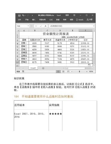 知识拓展 在工作表中选择要存放结果的单元格后,切换到【公式】选项卡, 单击【函数库】组中的【插入函数】按钮,也可打开【插入函数】对话 框。 184 不知道需要使用什么函数时应如何查询 适用版本 实用指数 Excel 2007、2010、2013、 ★★★★★ 2016