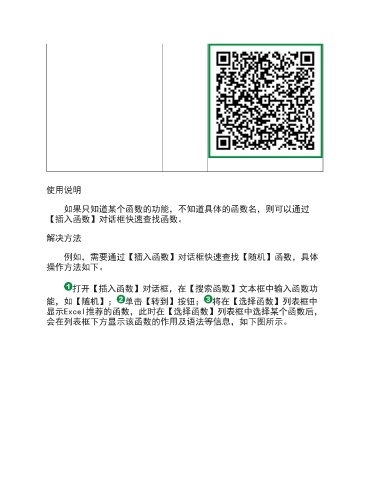使用说明 如果只知道某个函数的功能,不知道具体的函数名,则可以通过 【插入函数】对话框快速查找函数。 解决方法 例如,需要通过【插入函数】对话框快速查找【随机】函数,具体 操作方法如下。 打开【插入函数】对话框,在【搜索函数】文本框中输入函数功 能,如【随机】; 单击【转到】按钮; 将在【选择函数】列表框中 显示Excel推荐的函数,此时在【选择函数】列表框中选择某个函数后, 会在列表框下方显示该函数的作用及语法等信息,如下图所示。