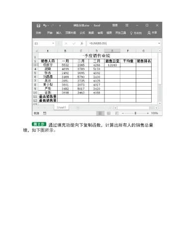 通过填充功能向下复制函数,计算出所有人的销售总量 绩,如下图所示。