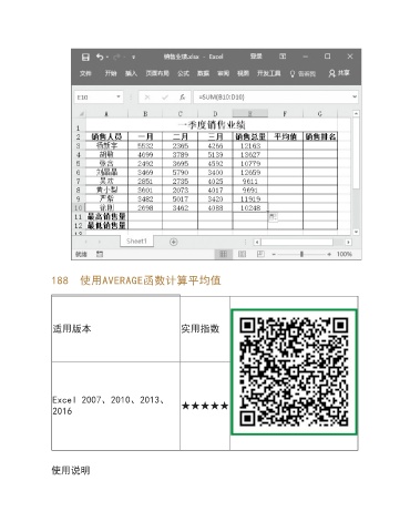 188 使用AVERAGE函数计算平均值 适用版本 实用指数 Excel 2007、2010、2013、 ★★★★★ 2016 使用说明