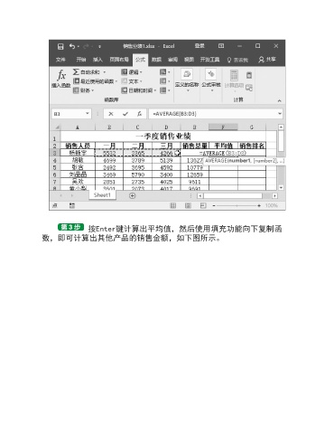 按Enter键计算出平均值,然后使用填充功能向下复制函 数,即可计算出其他产品的销售金额,如下图所示。