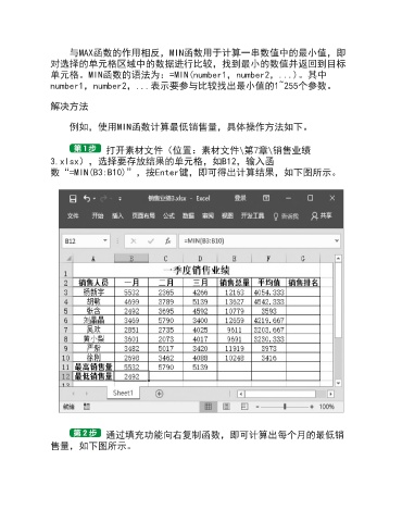 例如,使用MIN函数计算最低销售量,具体操作方法如下。