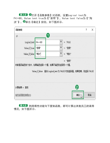 打开【函数参数】对话框,设置Logical test为 F4>=80,Value test true为【"录用"】,Value test false为【"淘 汰"】; 单击【确定】按钮,如下图所示。 利用填充功能向下复制函数,即可计算出其他员工的录用 情况,如下图所示。
