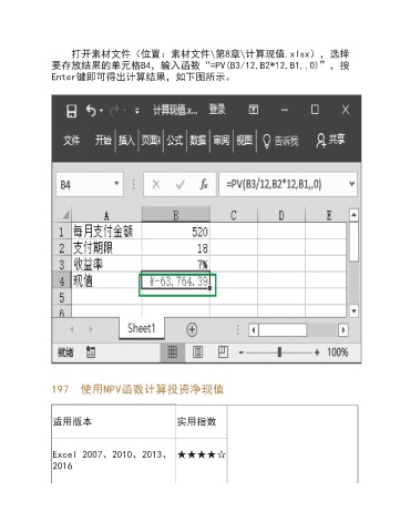 打开素材文件(位置:素材文件\第8章\计算现值.xlsx),选择 要存放结果的单元格B4,输入函数“=PV(B3/12,B2*12,B1,,0)”,按 Enter键即可得出计算结果,如下图所示。 197 使用NPV函数计算投资净现值 适用版本 实用指数 Excel 2007、2010、2013、 ★★★★☆ 2016