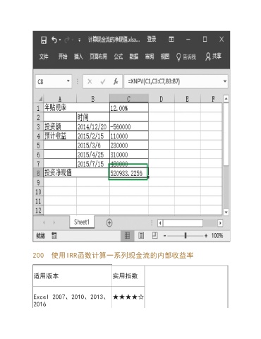 200 使用IRR函数计算一系列现金流的内部收益率 适用版本 实用指数 Excel 2007、2010、2013、 ★★★★☆ 2016