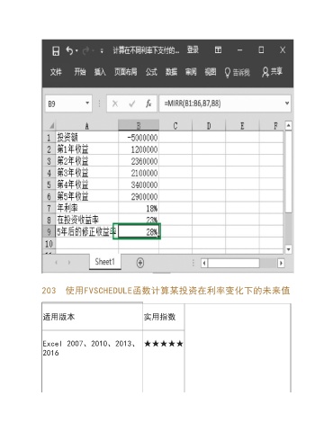 203 使用FVSCHEDULE函数计算某投资在利率变化下的未来值 适用版本 实用指数 Excel 2007、2010、2013、 ★★★★★ 2016