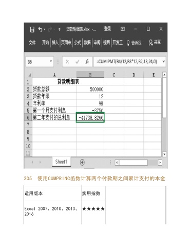 205 使用CUMPRINC函数计算两个付款期之间累计支付的本金 适用版本 实用指数 Excel 2007、2010、2013、 ★★★★★ 2016