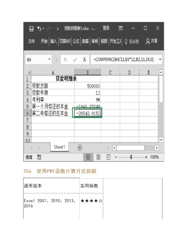 206 使用PMT函数计算月还款额 适用版本 实用指数 Excel 2007、2010、2013、 ★★★★☆ 2016