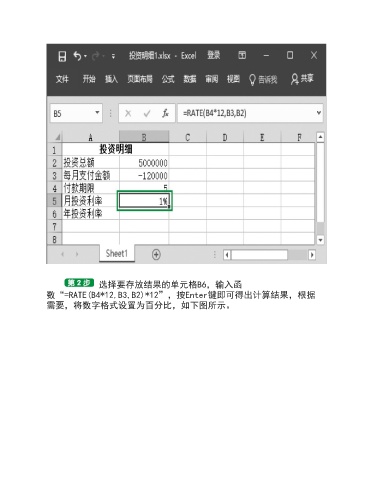 选择要存放结果的单元格B6,输入函 数“=RATE(B4*12,B3,B2)*12”,按Enter键即可得出计算结果,根据 需要,将数字格式设置为百分比,如下图所示。