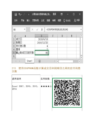 215 使用COUPNUM函数计算成交日和到期日之间的应付利息 次数 适用版本 实用指数 Excel 2007、2010、2013、 ★★★★☆ 2016