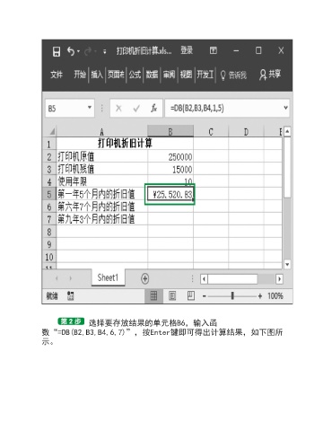 选择要存放结果的单元格B6,输入函 数“=DB(B2,B3,B4,6,7)”,按Enter键即可得出计算结果,如下图所 示。