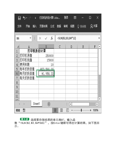 选择要存放结果的单元格B7,输入函 数“=SLN(B2,B3,B4*365)”,按Enter键即可得出计算结果,如下图所 示。