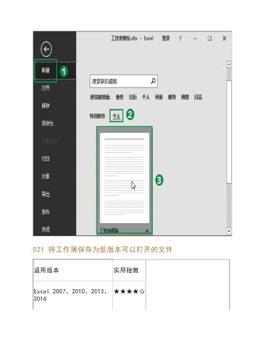021 将工作簿保存为低版本可以打开的文件 适用版本 实用指数 Excel 2007、2010、2013、 ★★★★☆ 2016