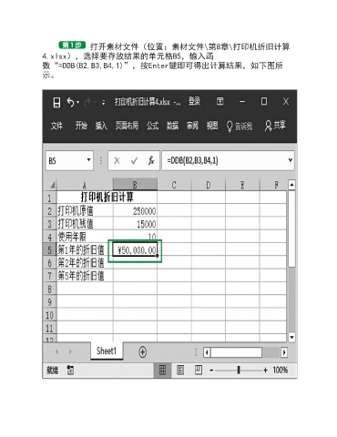 打开素材文件(位置:素材文件\第8章\打印机折旧计算 4.xlsx),选择要存放结果的单元格B5,输入函 数“=DDB(B2,B3,B4,1)”,按Enter键即可得出计算结果,如下图所 示。