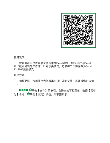 使用说明 若计算机中仅仅安装了低版本的Excel程序,则无法打开Excel 2016版本编辑的工作簿,针对该类情况,可以将工作簿保存为Excel 97-2003兼容模式。 解决方法 如果要将工作簿保存为低版本可以打开的文件,具体操作方法如 下。 单击【文件】菜单项,在弹出的下拉菜单中选择【另存 为】命令; 单击【浏览】按钮,如下图所示。