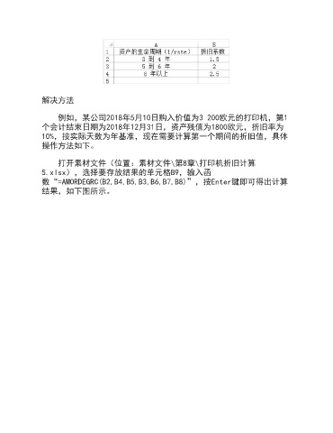 解决方法 例如,某公司2018年5月10日购入价值为3 200欧元的打印机,第1 个会计结束日期为2018年12月31日,资产残值为1800欧元,折旧率为 10%,按实际天数为年基准,现在需要计算第一个期间的折旧值,具体 操作方法如下。 打开素材文件(位置:素材文件\第8章\打印机折旧计算 5.xlsx),选择要存放结果的单元格B9,输入函 数“=AMORDEGRC(B2,B4,B5,B3,B6,B7,B8)”,按Enter键即可得出计算 结果,如下图所示。