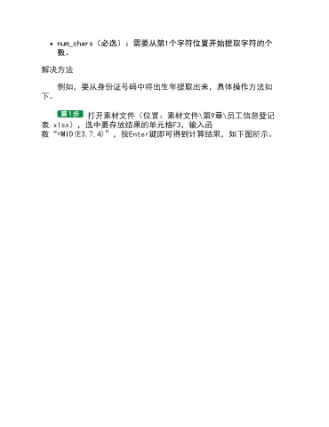 num_chars(必选):需要从第1个字符位置开始提取字符的个 数。 解决方法 例如,要从身份证号码中将出生年提取出来,具体操作方法如 下。 打开素材文件(位置:素材文件\第9章\员工信息登记 表.xlsx),选中要存放结果的单元格F3,输入函 数“=MID(E3,7,4)”,按Enter键即可得到计算结果,如下图所示。