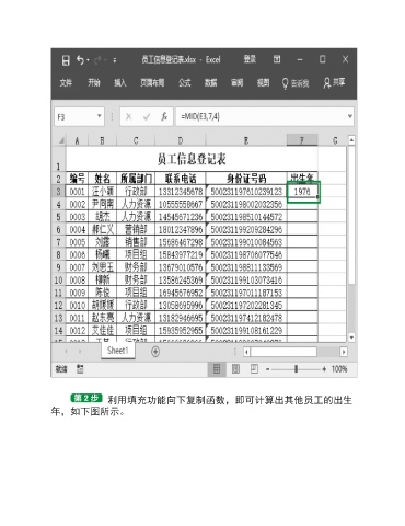 利用填充功能向下复制函数,即可计算出其他员工的出生 年,如下图所示。