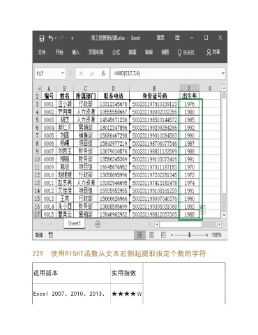 229 使用RIGHT函数从文本右侧起提取指定个数的字符 适用版本 实用指数 Excel 2007、2010、2013、 ★★★★☆