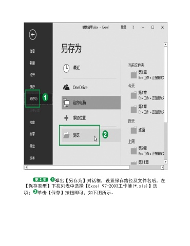 弹出【另存为】对话框,设置保存路径及文件名后,在 【保存类型】下拉列表中选择【Excel 97-2003工作簿(*.xls)】选 项; 单击【保存】按钮即可,如下图所示。