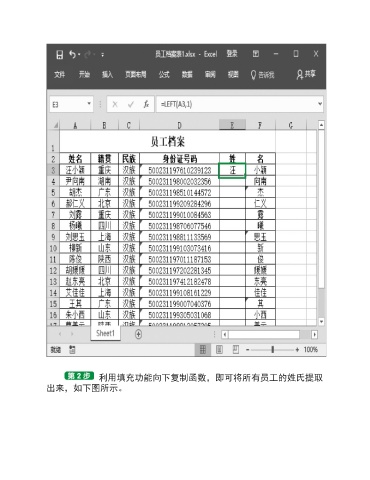 利用填充功能向下复制函数,即可将所有员工的姓氏提取 出来,如下图所示。