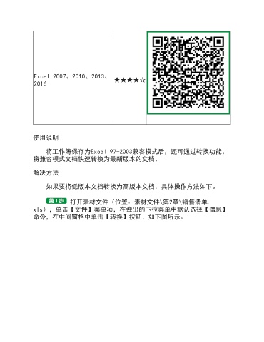 Excel 2007、2010、2013、 ★★★★☆ 2016 使用说明 将工作簿保存为Excel 97-2003兼容模式后,还可通过转换功能, 将兼容模式文档快速转换为最新版本的文档。 解决方法 如果要将低版本文档转换为高版本文档,具体操作方法如下。 打开素材文件(位置:素材文件\第2章\销售清单. xls),单击【文件】菜单项,在弹出的下拉菜单中默认选择【信息】 命令,在中间窗格中单击【转换】按钮,如下图所示。