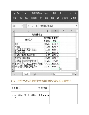 236 使用VALUE函数将文本格式的数字转换为普通数字 适用版本 实用指数 Excel 2007、2010、2013、 ★★★★★ 2016