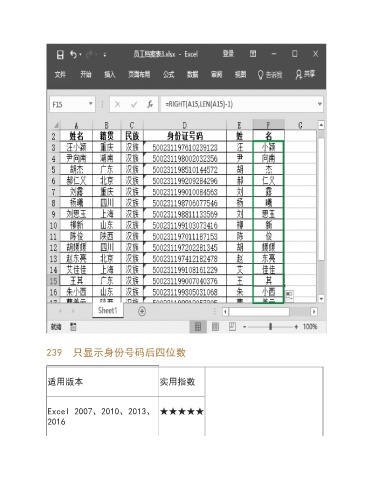 239 只显示身份号码后四位数 适用版本 实用指数 Excel 2007、2010、2013、 ★★★★★ 2016