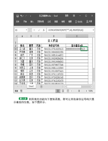 利用填充功能向下复制函数,即可让其他身份证号码只显 示最后四位数,如下图所示。