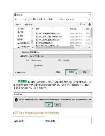 弹出提示对话框,提示已成功转换为当前的文件格式,若 要使用当前文件格式的新功能和增强功能,需关闭并重新打开。单击 【是】按钮即可,如下图所示。 023 将工作簿保存为PDF格式的文档 适用版本 实用指数
