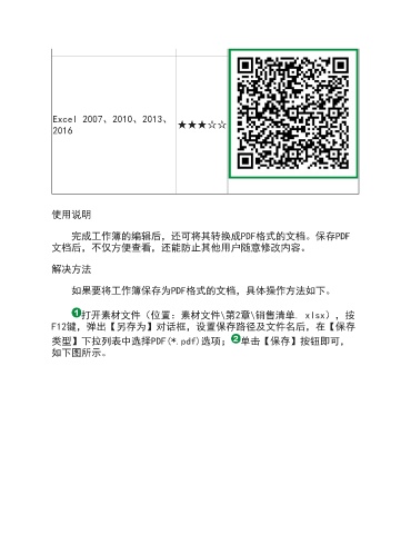 Excel 2007、2010、2013、 ★★★☆☆ 2016 使用说明 完成工作簿的编辑后,还可将其转换成PDF格式的文档。保存PDF 文档后,不仅方便查看,还能防止其他用户随意修改内容。 解决方法 如果要将工作簿保存为PDF格式的文档,具体操作方法如下。 打开素材文件(位置:素材文件\第2章\销售清单. xlsx),按 F12键,弹出【另存为】对话框,设置保存路径及文件名后,在【保存 类型】下拉列表中选择PDF(*.pdf)选项; 单击【保存】按钮即可, 如下图所示。