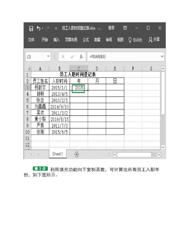 利用填充功能向下复制函数,可计算出所有员工入职年 份,如下图所示。