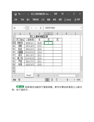 利用填充功能向下复制函数,即可计算出所有员工入职月 份,如下图所示。