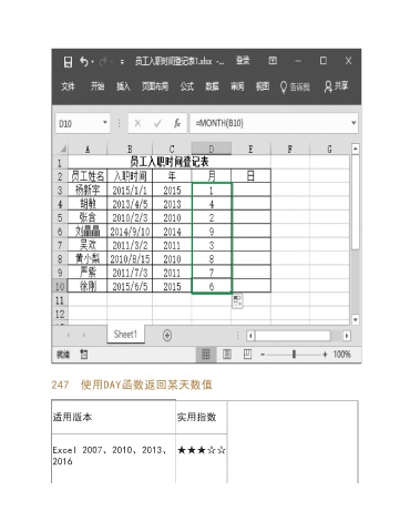 247 使用DAY函数返回某天数值 适用版本 实用指数 Excel 2007、2010、2013、 ★★★☆☆ 2016