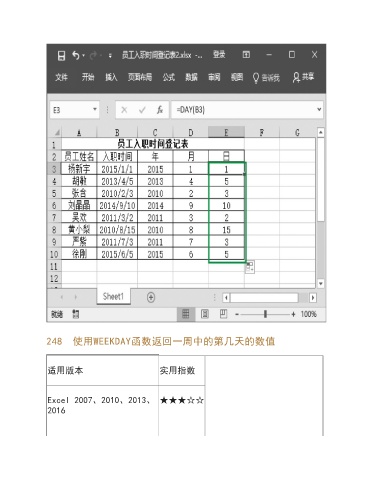 248 使用WEEKDAY函数返回一周中的第几天的数值 适用版本 实用指数 Excel 2007、2010、2013、 ★★★☆☆ 2016